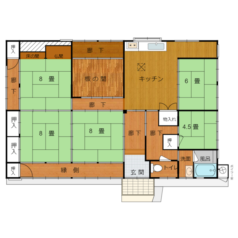 6LDK、リビング:12帖、和室:8,8,8,6,4.5帖、洋室:6帖